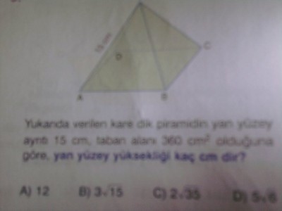 tabanın bir kenarına a dersek   a kare =360 yani a=6kök10   ,kareye köşegen çekersek 12 kök 5 olur. üst noktadan aşağı ,yani köşegene dik çekersek  bir dik üçgen oluşacak. o çektiğimiz yüksekliğe x dersek  (6kök5 )in karesi + x in karesi = 15 in karesi  x=3kök5   ,inşallah yardımcı olabilmişimdir