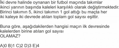 İki devre halinde oynanan futbol maçında takımlar ikinci yarının başında kaleleri karşılıklı olarak değiştirmektedir. Birinci takımın 5, ikinci takımın 1 gol attığı bu maçta her iki kaleye iki devrede atılan toplam gol sayısı eşittir. Buna göre, aşağıdakilerden hangisi maçın ilk devresinde kalelerden birine atılan gol sayısı OLAMAZ? A)0 B)1 C)2 D)3 E)4 matsoru.jpg