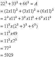 22^2+33^2+66^2 =(2*11)^2 + (3*11)^2 + (6*11)^2 =11^2*(2^2 + 3^2 + 6^2) =11^2*49 =11^2*7^2 =77^2 =5929 New Picture (3).jpg