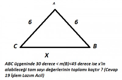 m(b)=45 ise hipotenüs 6kök2 yani yaklaşık 8,... cm olurdu m(B)=30 ise 120nin karşısı en çok 10,... cm olurdu yani 30<m(b)<45 olduğuna göre CB 8,... ve 10,... arasındaki değerleri alabilir bu aralıktaki iki tam sayı değeri 9 ve 10dur; 9+10=19