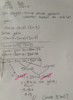 ab ve ba sayısı iki basamaklı sayılardır. ab sayısı rakamları toplamının (2x-3) katına , ba sayısı da rakamları toplamının (3x-1) katına eşit olduğuna göre x , kaçtır ?