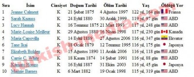 Dünyanın en yaşlı insanı bilindiği kadarı ile Fransadan bir kadın: Jeanne Calment Doğum Tarihi: 21 Şubat 1875 Ölüm Tarihi: 4 Ağustos 1997 Yaş: 122 yıl, 164 gün Diğer en yaşlıları görmek için lütfen ekteki resime bakınız... :) yasli_insan.jpg