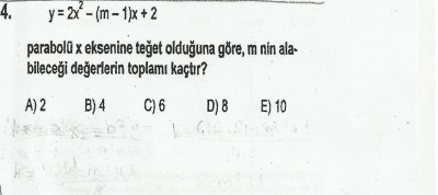 delta =0 olmalı çünkü x eksenine teğet yani b kare - 4ac=0 olacak m2-2m+1-4.2.2=0 burdan m=5 ve m=-3 cıkar toplamları 2 dir