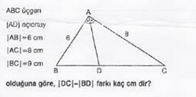 abc üçgen |AD | açıortay |AB|=6 cm |AC|= 8 cm |BC|= 9 cm olduğuna göre |DC|-|BD| farkı kaç cm dir soru.png