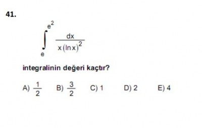 Resimli soru belirli integral (üst sınır e üssü 2) (alt sınır e ) dx / x(lnx)üssü 2 [not: (lnx) in üssü 2 ] değeri kaçtır? Resimli soru integral.jpg